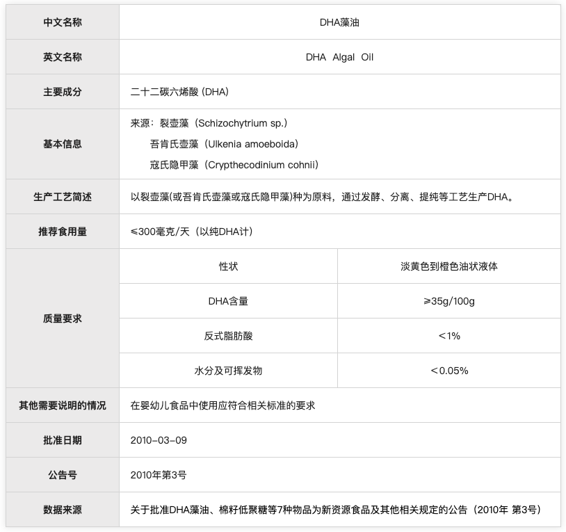 2011年,標準落地:GB 26400-2011《二十二碳六烯酸油脂(發酵法)》,推動行業從“非標生產”走向“標準化”;GB 14880-2012《食品營養強化劑使用標準》明確,DHA可作為營養強化劑用于兒童、孕產婦用乳粉。