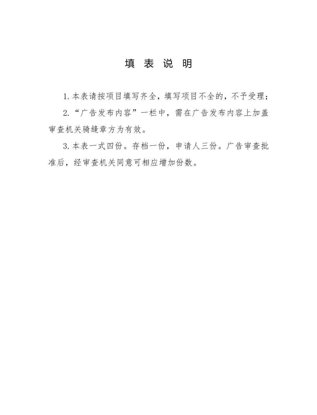 1、《廣告審查表》一式四份。如申請發(fā)布電視廣告、聲音廣告,需另附音、視頻光盤及文字腳本。